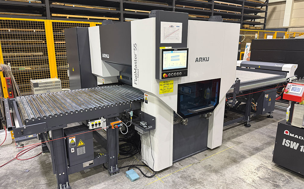 国内最大級の216棚を誇る材料棚では、多種多様な材料を常備しており、ブランク加工機と連携することで24時間の無人稼働を実現しています。